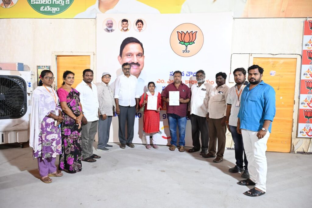 ఎన్డీఏ కార్యాలయంలో అందజేసిన 53 వ డివిజన్ బీజేపీ అధ్యక్షుడు అడ్డూరి ఉదయ భాస్కర్, 49 వ డివిజన్ టీడీపీ అధ్యక్షుడు బడుగు వెంకన్న ,ఎమ్మెల్యే కార్యాలయ కార్యదర్శి ప్రత్తిపాటి శ్రీధర్