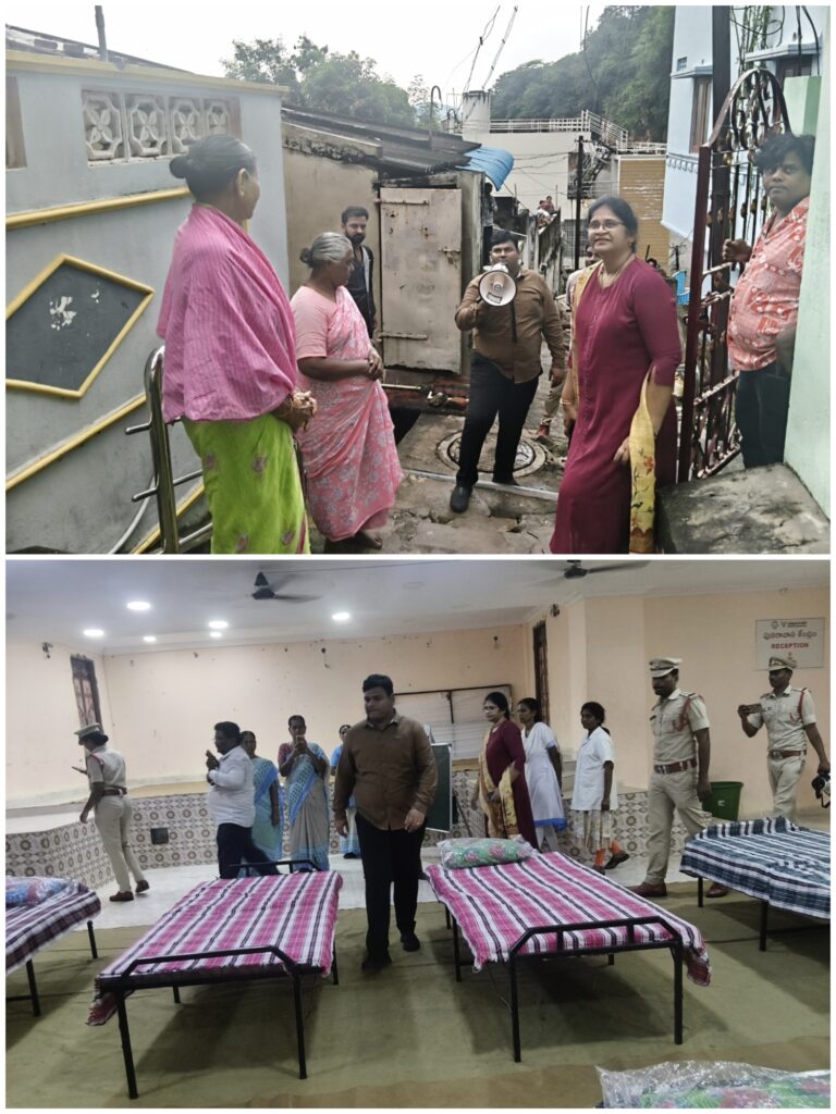 విజయవాడ ఆర్డీవో కావూరి చైతన్య మంగళవారం విజయవాడ అర్బన్ పరిధిలోని చిట్టినగర్, గుణదలతో పాటు మొగల్రాజపురంలో కొండచరియల ముప్పు ఉన్న ప్రాంతాలలో పర్యటించి ప్రజలకు అవగాహన కల్పించారు. ఇప్పటికే దాదాపు 500 కుటుంబాలను పునరావాస కేంద్రాలకు తరలించారు. అప్రమత్తంగా ఉండాలని.. నిర్లక్ష్యం చేయకుండా పునరావాస కేంద్రాలను ఉపయోగించుకోవాలని సూచించారు. విజయవాడ నగరంలో ప్రమాదకరంగా ఉన్న ఆర్టీఏ కార్యాలయం గోడ అంచున నివసిస్తున్న 13 కుటుంబాలను ఖాళీ చేయించి పునరావాస కేంద్రాలకు తరలించారు. వీఎంసీ, ఆర్ అండ్ బి అధికారుల సహకారంతో శిథిలావస్థలో ఉన్న ఆ గోడను తొలగించారు. మాచవరం అంబేద్కర్ కమ్యూనిటీ హాలులో ఏర్పాటుచేసిన పునరావాస కేంద్రం, ఆర్ఆర్ పేట పునరావాస కేంద్రం, మాచవరంలో దుర్బలంగా (వల్నరబుల్) భవనాలను పరిశీలించి పలు సూచనలు చేశారు. బుడమేరు కాలువ ప్రవాహాన్ని మధ్యకట్ట నుంచి గూడవల్లి వరకు పరిశీలించారు.